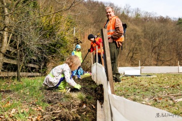 Hlavní pracovní náplní bylo budování bariér podél silnice, které zabrání žábám vstoupit na vozovku. V sobotu jsme pracovali poblíž Křtin, v neděli jsme se přesunuli do oblasti Býčí skály. Práce byla náročná, ale s nadšením pro dobrou věc šla od ruky – nejprve jsme pomocí rýčů a krumpáče vykopali rýhu a vedle rýhy zatloukli vodící kolíky. Na kolíky jsme pak přicvakli fólii a na závěr jsme spodní okraj fólie zahrnuli hlínou. Počasí nám dopřálo krásný sluneční víkend a díky spolupráci s dalšími skupinami dobrovolníků se podařilo vybudovat stovky metrů ochranných zábran.
